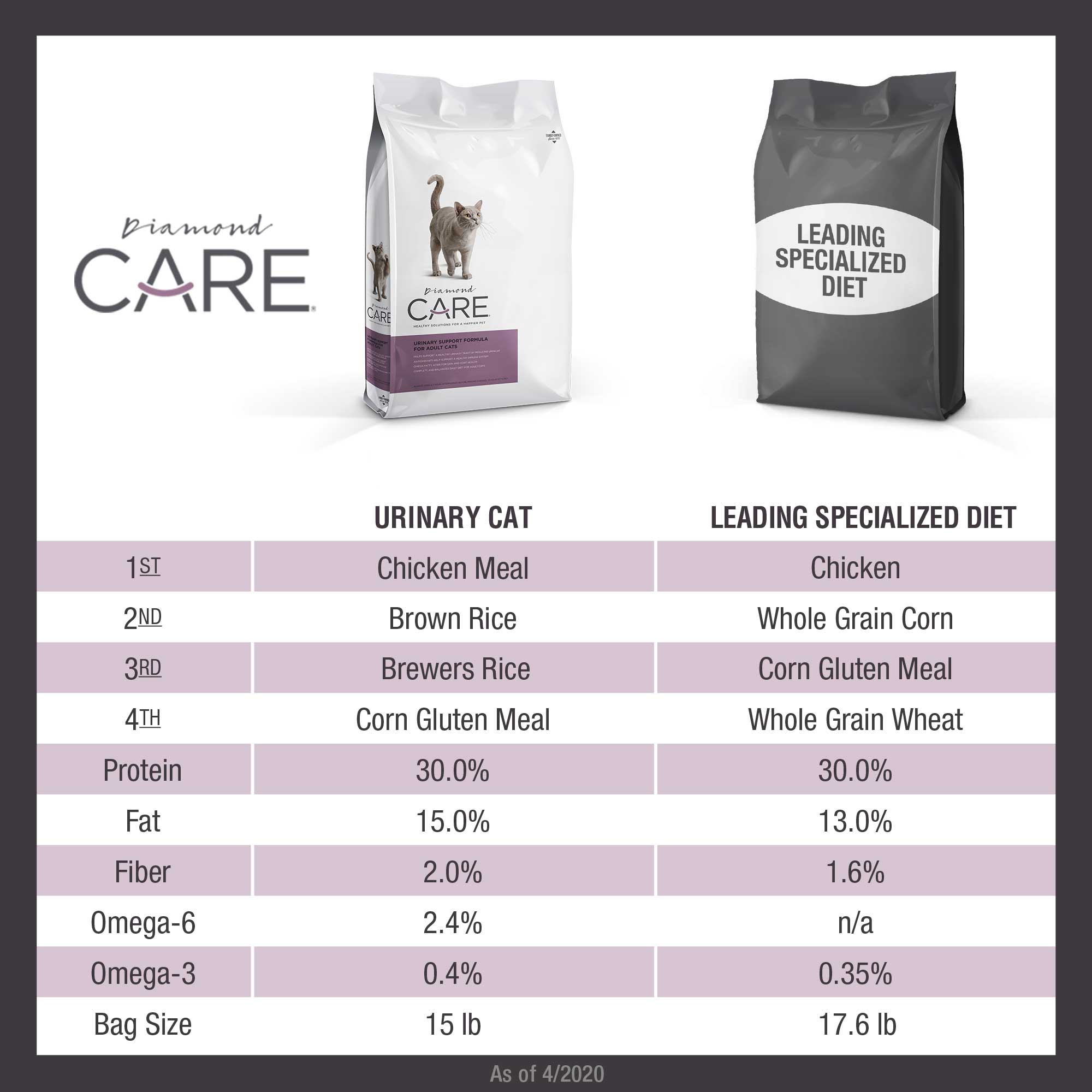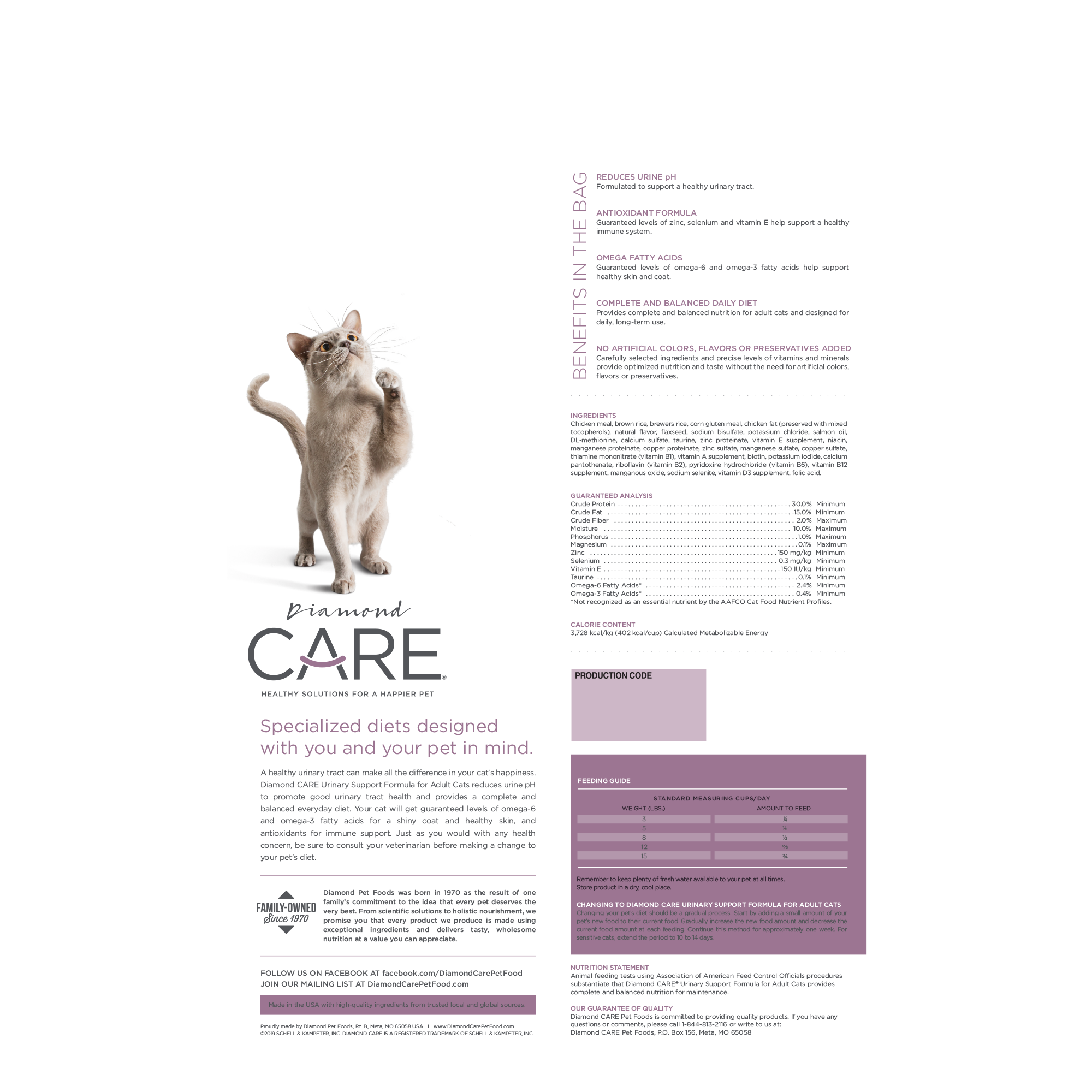 Animal feeding tests using Association of American Feed Control Officials procedures substantiate that Diamond CARE Urinary Support Formula for Adult Cats provides complete and balanced nutrition for maintenance.