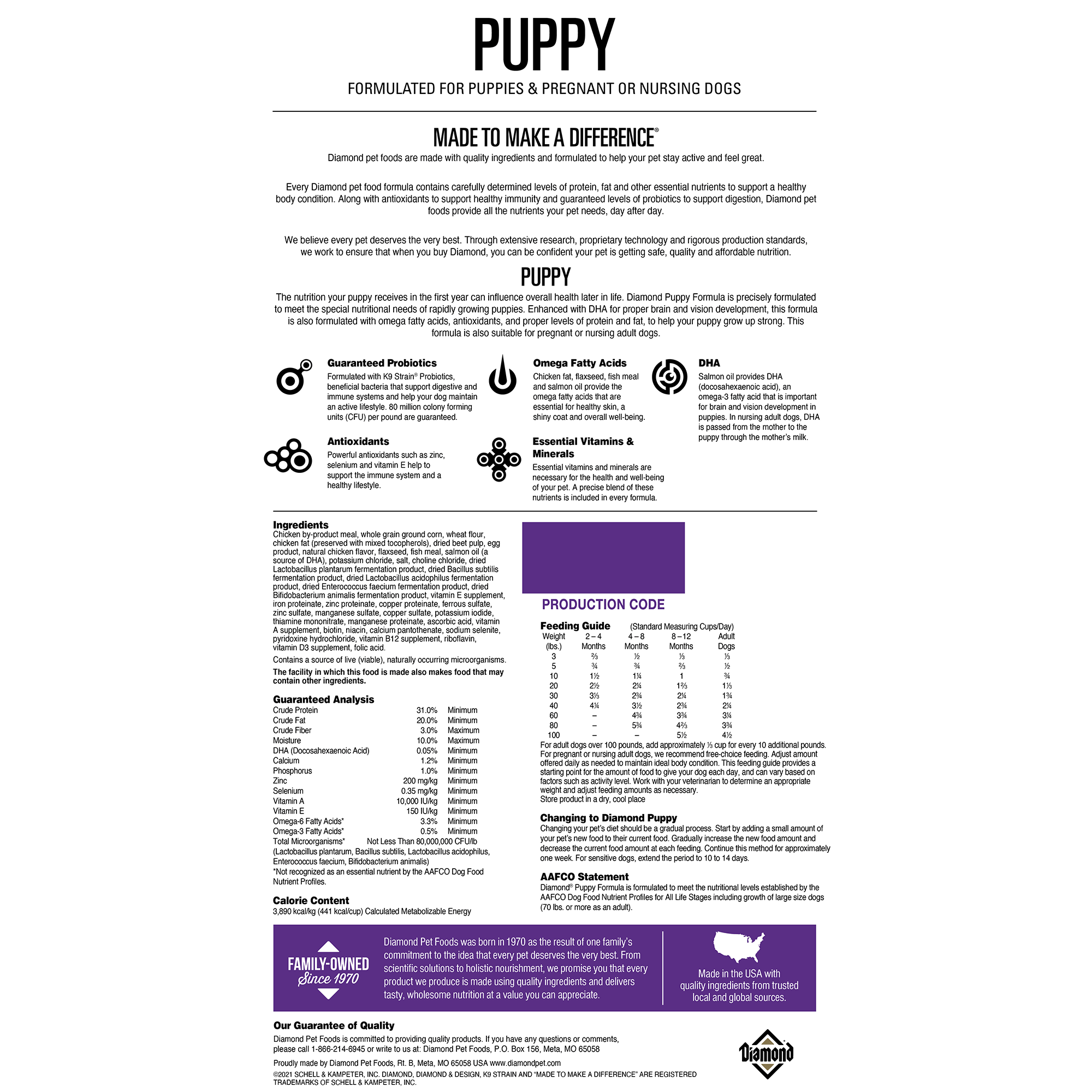 Diamond Puppy Formula is formulated to meet the nutritional levels established by the AAFCO Dog Food Nutrient Profiles for All Life Stages including growth of large size dogs (70 lbs. or more as an adult).