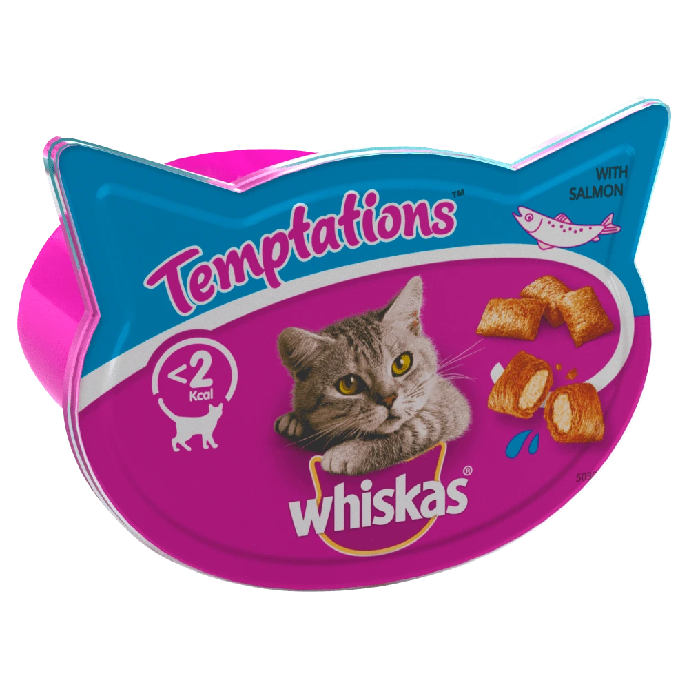 WHISKAS® TEMPTATIONS™ with Salmon flavour. For adult cats, 60g pot.